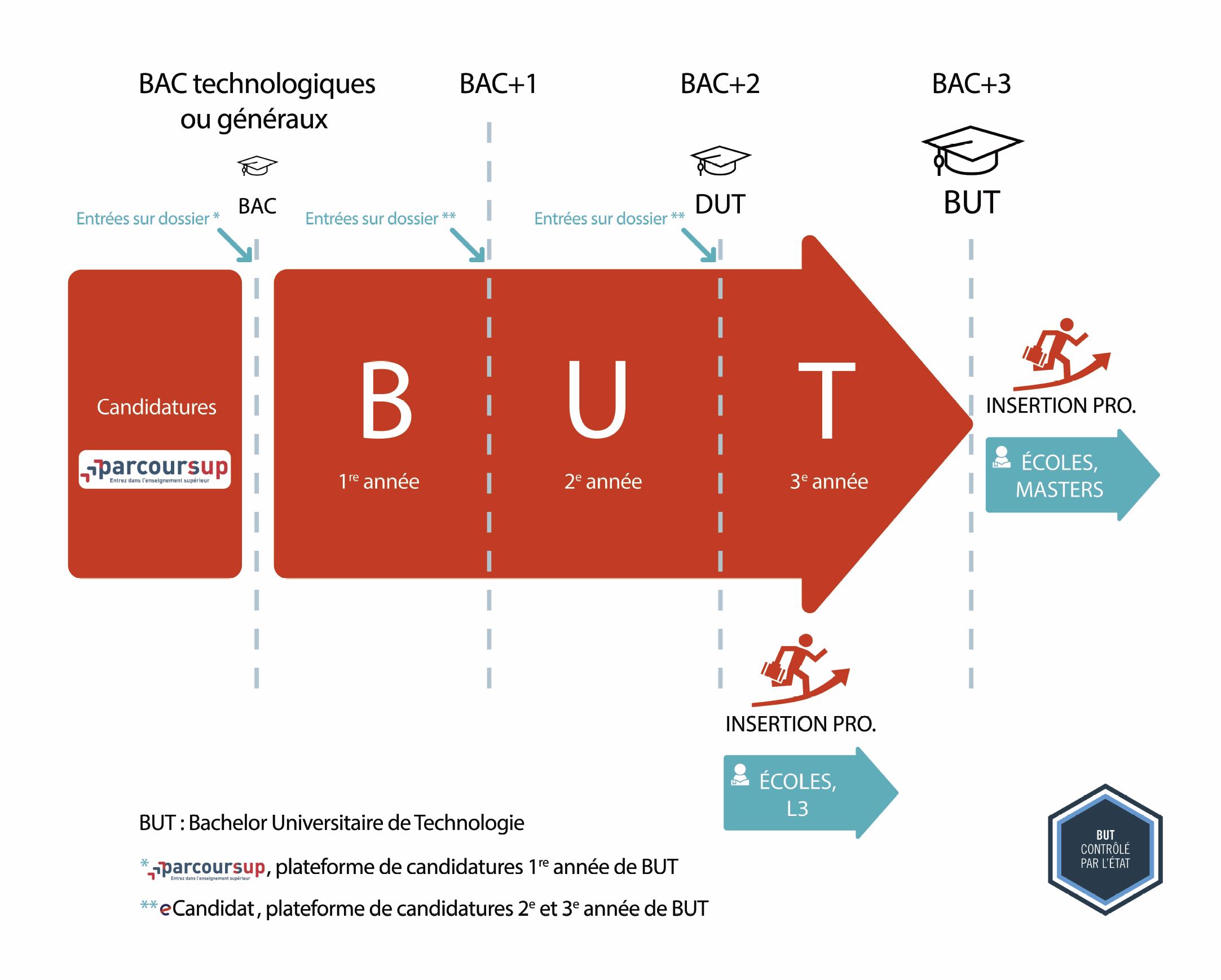 Le BUT est ouvert aux bacs technologiques et aux bacs généraux (et autres diplômes). Pour candidater, rendez-vous sur la plateforme Parcoursup entre janvier et mars.