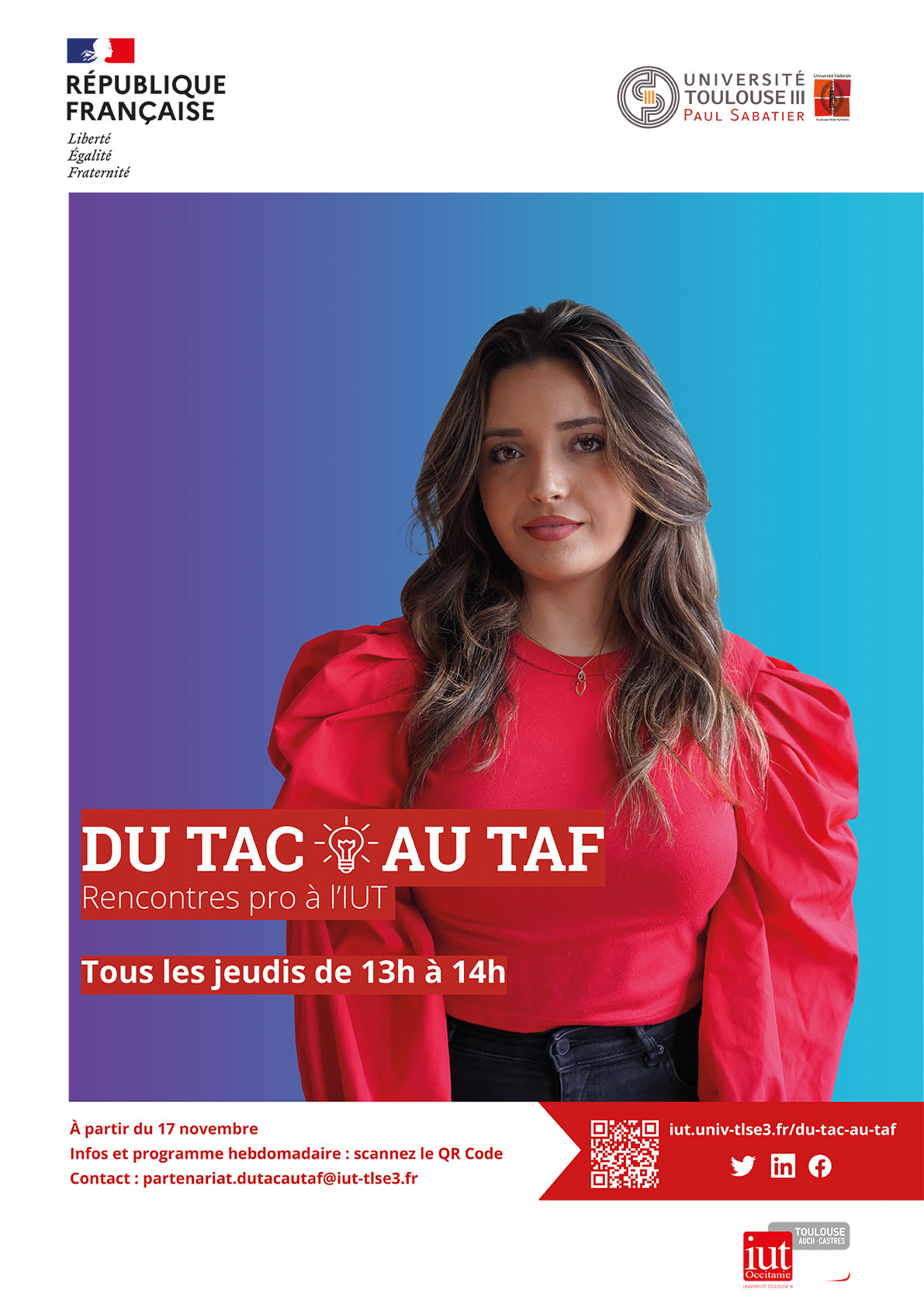 De novembre à mars 2023, chaque jeudi, du TAC au TAF ! Le Service partenariats de l’IUT Toulouse Auch Castres proposera aux étudiantes et étudiants de l'IUT de rencontrer des intervenants professionnels pour échanger sur leur parcours, des sujets d'actualité ou encore des problématiques transversales. Ces rencontres se dérouleront tous les jeudis de 13h à 14h.